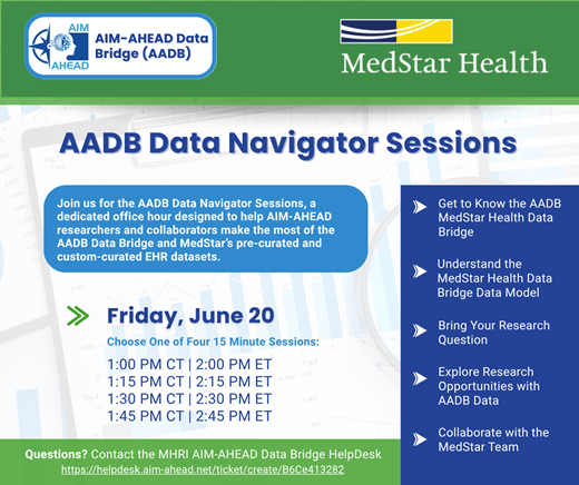 This dedicated office hour is designed to help AIM-AHEAD researchers and collaborators make the most of the AADB Data Bridge and MedStar’s pre-curated and custom-curated EHR datasets.